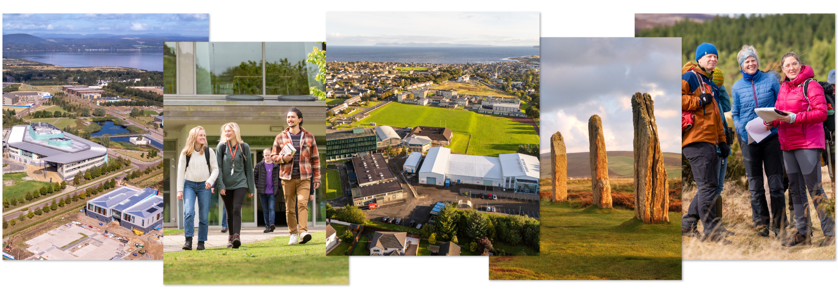 Aerial view of UHI Inverness campus | Students walking away from a building | Aerial view of UHI NWH Thurso campus | Standing stones in Orkney | Group of people in a field talking