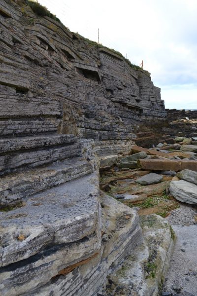 As with the attempt to disguise the wartime concrete defences, it’s interesting to note the ways in which people have tried to make the manmade strata of sea defences less obtrusive. A particularly striking example of this geological fakery can be found at the Brough of Birsay. Now a small tidal island severed from the mainland over a thousand years ago by the forces of coastal erosion, today concrete defends the heritage site, but tries to do so without drawing too much attention to itself: patterning on the defences mimics the strata of the sandstone.