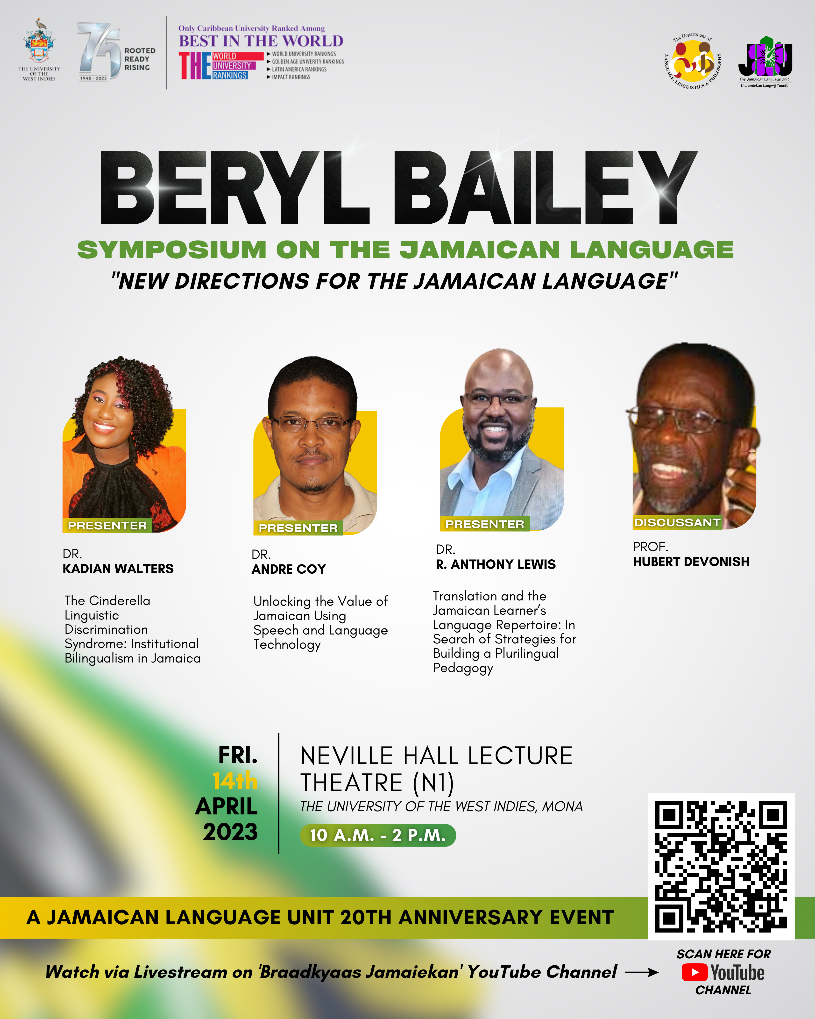 This symposium is livestreamed on the Braadkyaas Jamiekan YouTube channel – the JLU’s media platform which provides a community-facing link for speakers of Jamaican, in much the same way as Island Voices has aimed to bridge gaps between academic linguists and vernacular Gaelic speakers in the Hebrides.