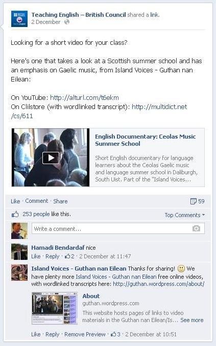 Tha 1.1 millean luchd-leantail aig duilleag Facebook na Comhairle Breatannaich airson luchd-teagaisg na Beurla: Teaching English – British Council.