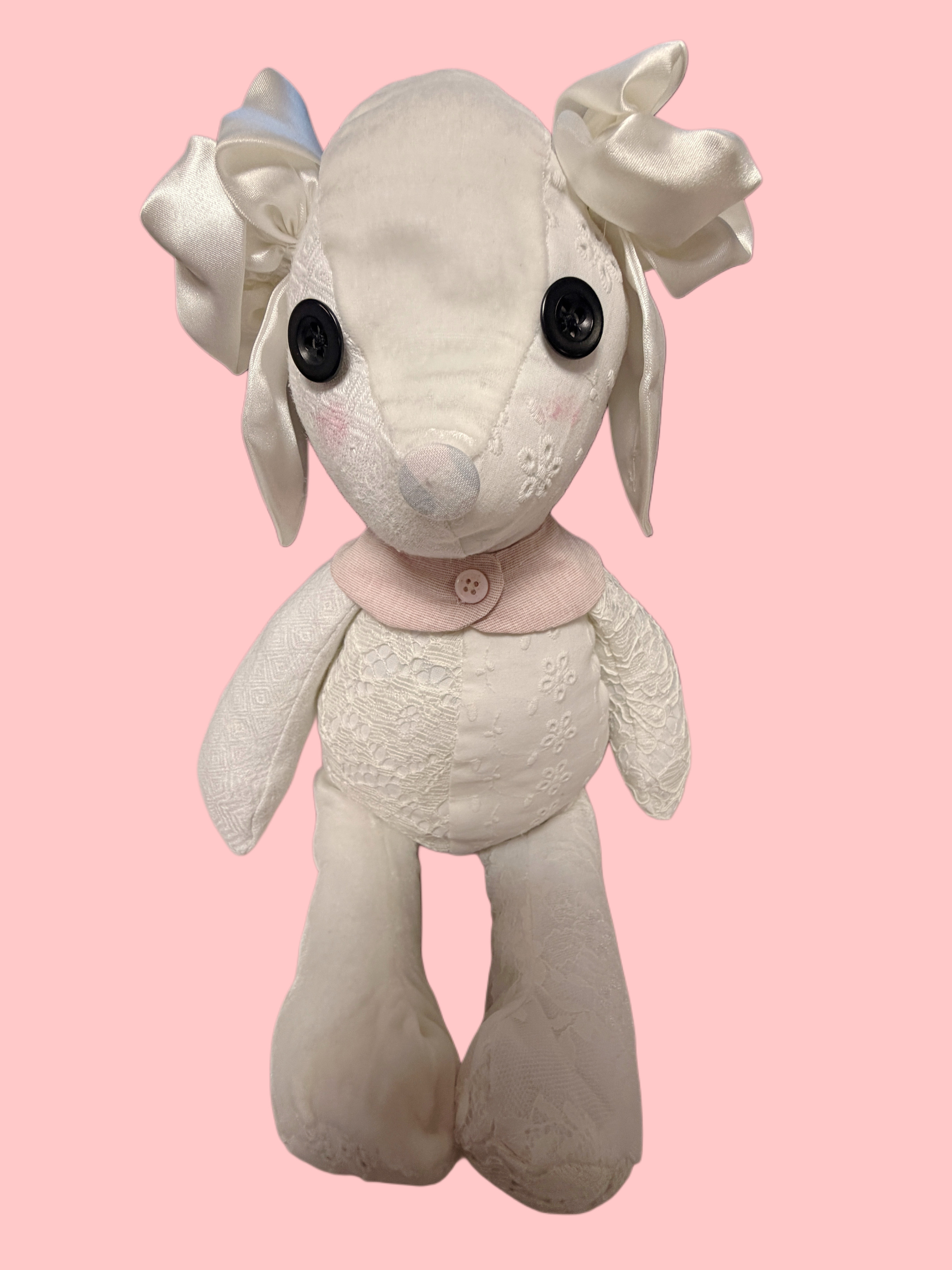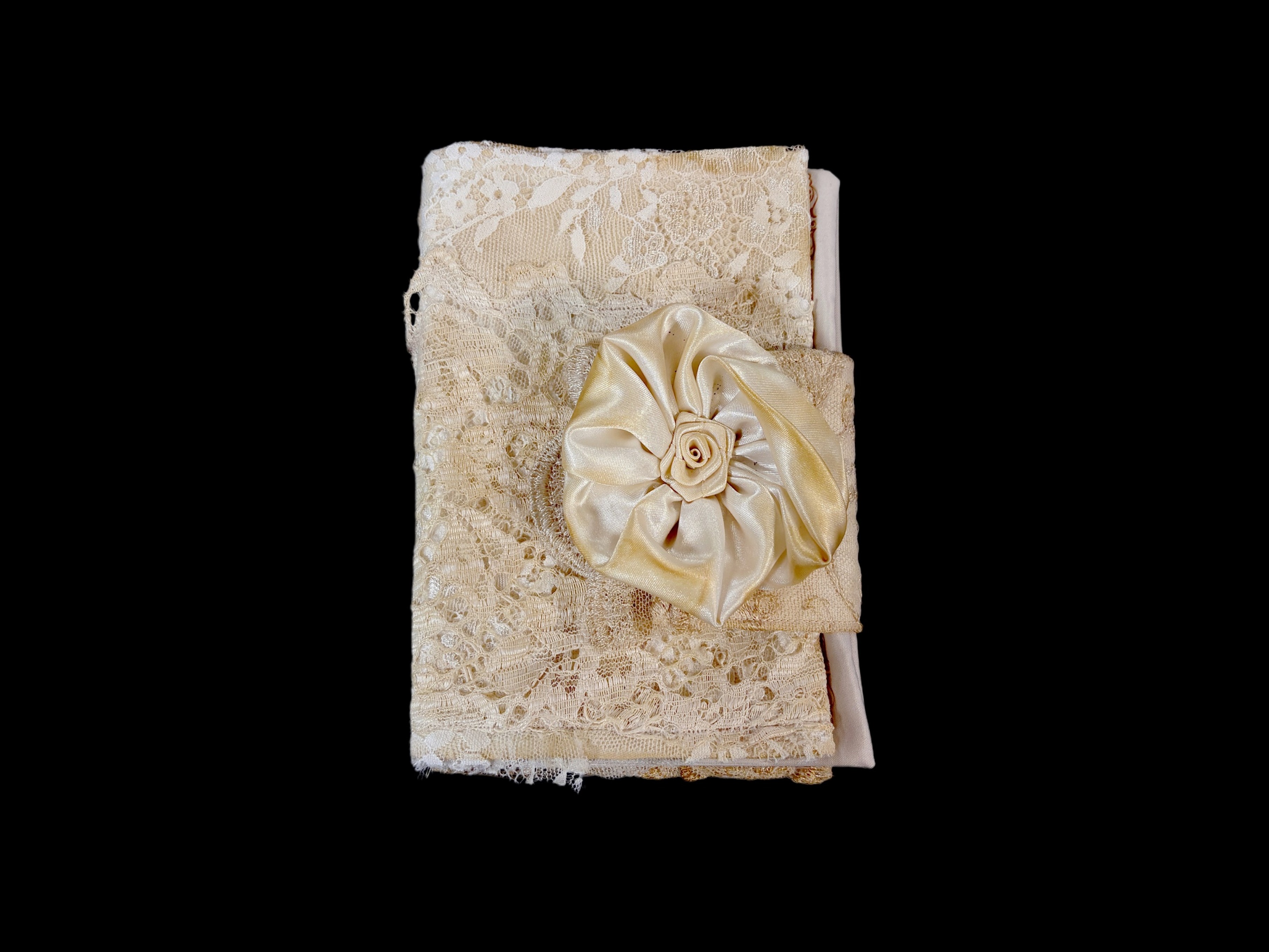 A closed textile book by Oliwia Palicka, featuring a cover crafted from intricate cream lace and adorned with a large, handmade satin fabric rose.Three people in bridal attire pose against a dark background: one seated in a large tulle gown with red roses, another in a short satin dress with white roses, and a third in a lace gown with a floral crown.A handmade memory bunny soft toy crafted from various white lace and patterned fabrics, featuring black button eyes, satin bow ears, and a small pink collar, set against a pink background.An ivory vintage-style wedding dress with large puffed sleeves, intricate lace embroidery on the bodice and waist, and a voluminous tiered ruffled skirt, hanging on a clothing rack.A person with pink-toned hair wearing a long-sleeved, floor-length indigo ombré dress with a floral pattern, standing in a classroom or workshop setting.An open textile book titled Woven Memories, featuring printed cursive text and gold floral illustrations on fabric pages with lace and button detailing.